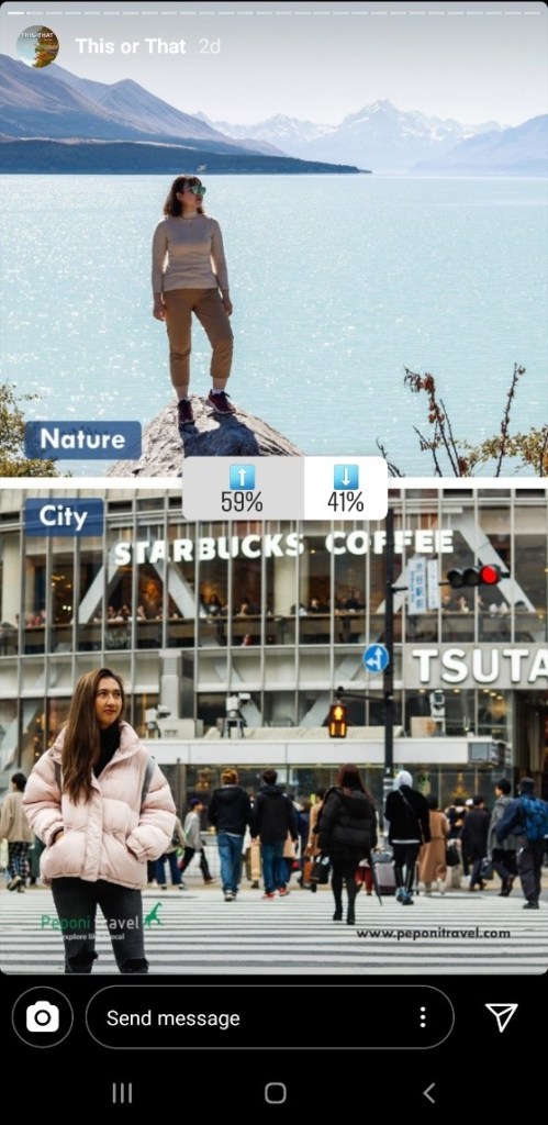 Pada Pilihan pertama Nature Vs City, Nature berhasil memenangkan pilihan pertama tersebut dengan total (59%) dan City (41%). Kira-kira rekomendasi Peponi Travel untuk destinasi Nature dan city kemana yah?