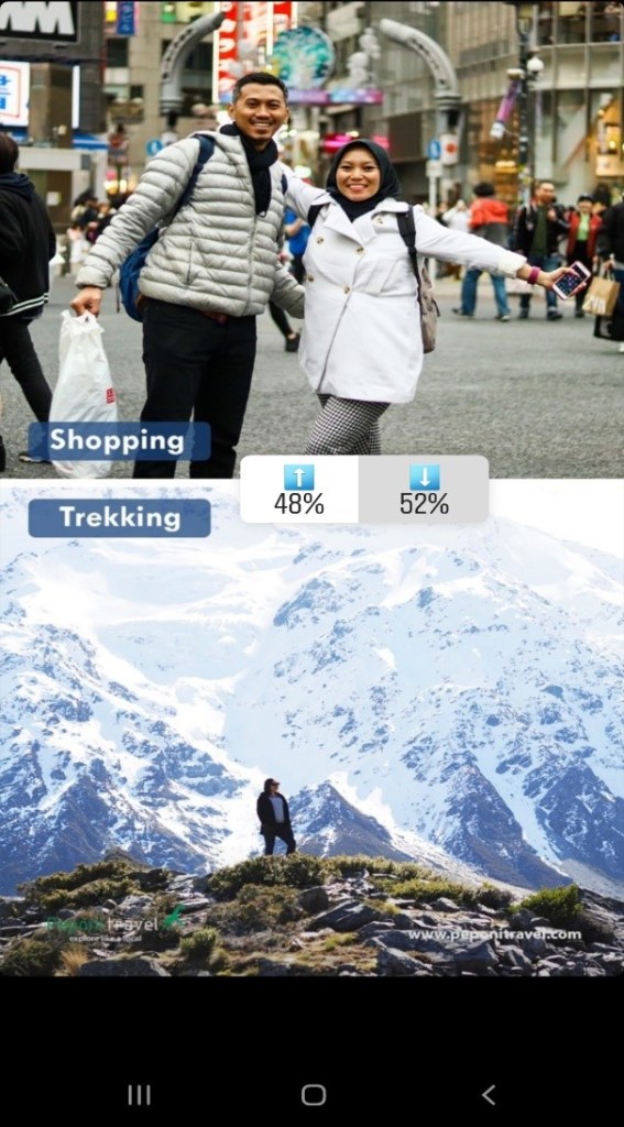 Pilihan terakhir adalah Shopping vs Trekking, hasilnya cukup ketat dengan keunggulan trekking (52%) dan shopping (48%). Wah, ternyata kamu lebih suka menjelajahi alam ya daripada berbelanja!