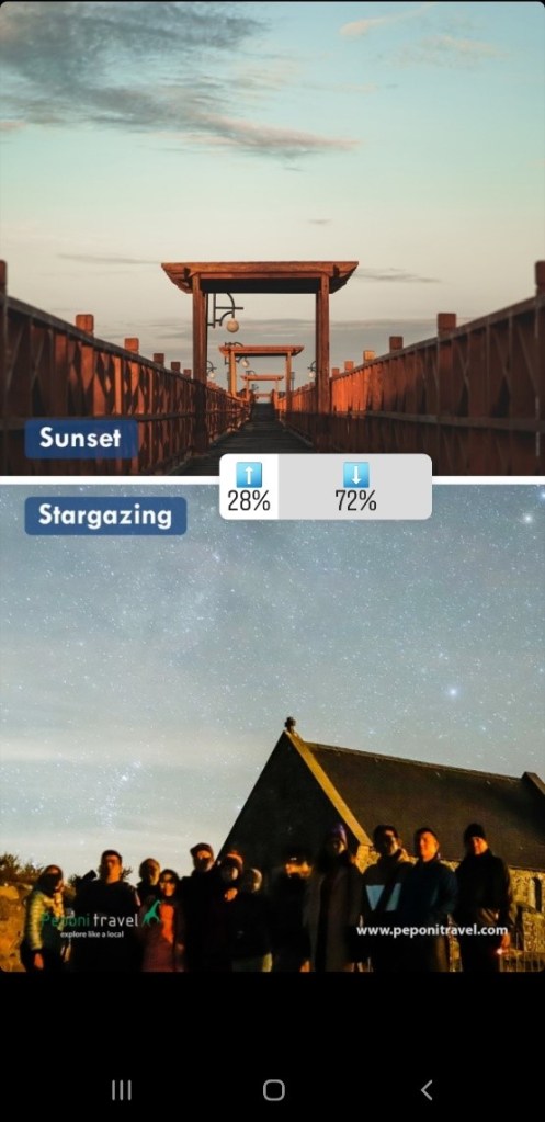 Pilihan ketiga Sunset Vs Stargazing berhasil dimenangkan oleh Stargazing dengan (72%) sedangkan Sunset mendapatkan hasil akhir (28%). Nah, destinasi rekomendasi Peponi Travel untuk Stargazing adalah New Zealand tepatnya di Mackenzie Area, lokasi dari International Largest Dark Sky Reserve yang telah didedikasikan khusus untuk menikmati langit malam. Sedangkan untuk Sunset Peponi tetap merekomendasikan New Zealand tepatnya di Queenstown, sebuah kota di pinggir danau glacier. Kamu dapat menikmati sunset sambil menyeruput kopi hangat. Slurrrppp Relax…..