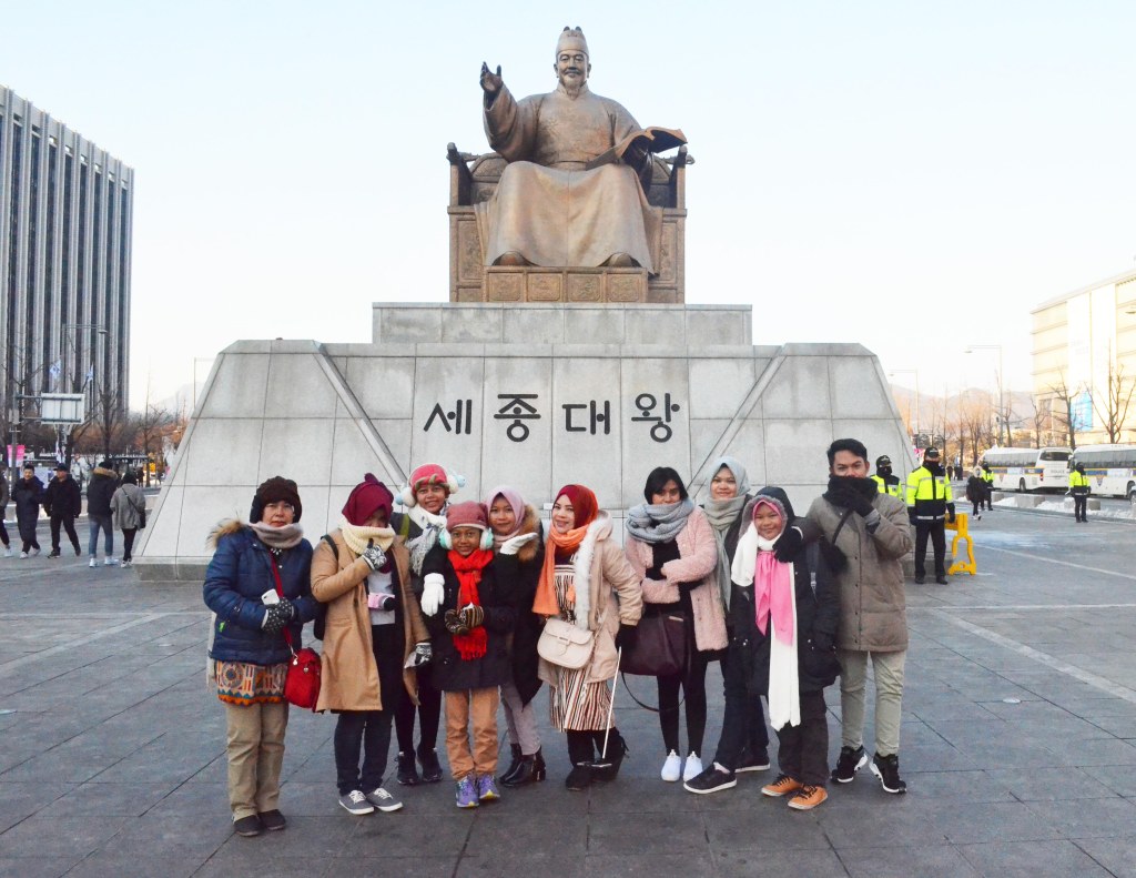 berfoto bersama di depan Patung Raja Sejong, Gwanghwamun Square