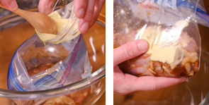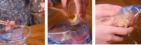 2. Masukkan potongan ayam kedalam plastik pembungkus, lalu bawang putih, garam, merica, jahe dan kecap. Campurkan hingga merata.