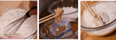 4. Siapkan, tepung terigu. Lalu masukkan potongan ayam yang sudah di bumbu ke dalam tepung. Balur tepung hingga merata.