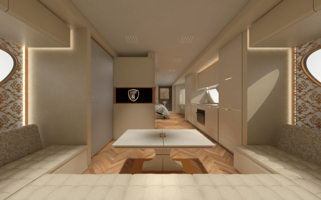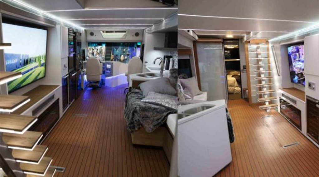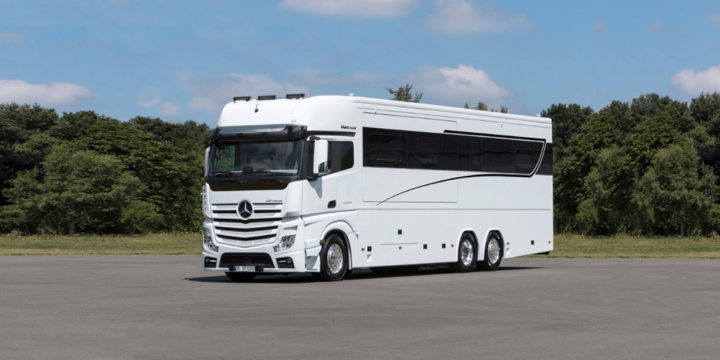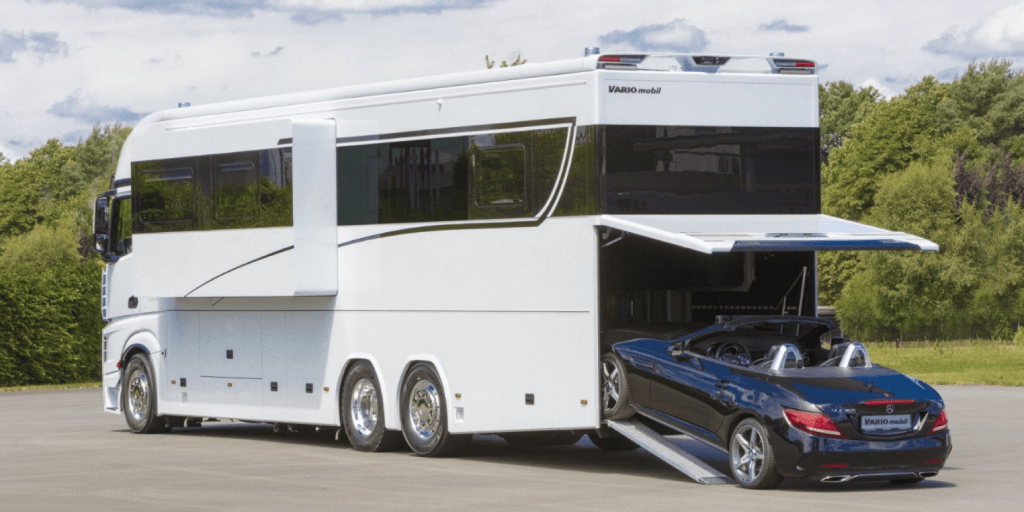 Mobil ini menggunakan dasar mesin bus Mercedez Benz atau Volvo. Mobil ini memiliki fasilitas layaknya rumah seperti adanya ruang tamu, dapur. kamar mandi dan kamar tidur. Uniknya mobil ini memiliki garasi mini yang mampu menampung mobil dengan ukuran seperti Ferarri 458, Porsche 911 dan Bmw I-8. Wah, ini akan memudahkan jika pemilik mobil hendak berkeliling kota tujuan dengan supercar tanpa perlu menyewa mobil towing.