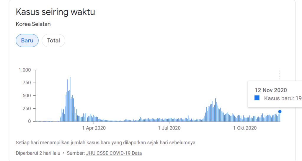 Usaha tak akan mengkhianati hasil. Korea Selatan yang berjuang untuk melawan Covid -19 mendapatkan hasil yang memuaskan dengan tingkat kesembuhan yaitu 25,636! Angka kesembuhan tersebut hampir menyamai angka total kasus yang diterima per 14 November 2020 yaitu 28,338. Hal ini membuat Korea Selatan berhasil menjadi salah satu sorotan dunia tentang keberhasilan dalam mengendalikan Covid-19.