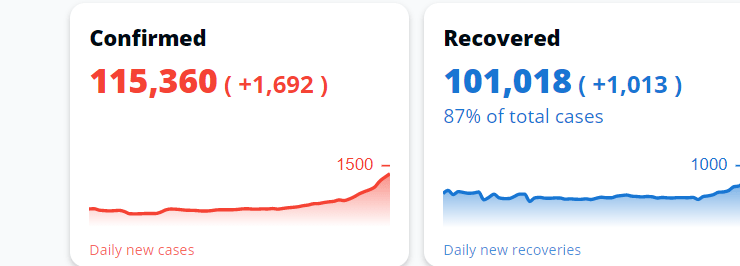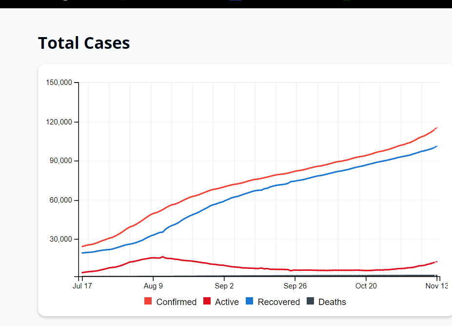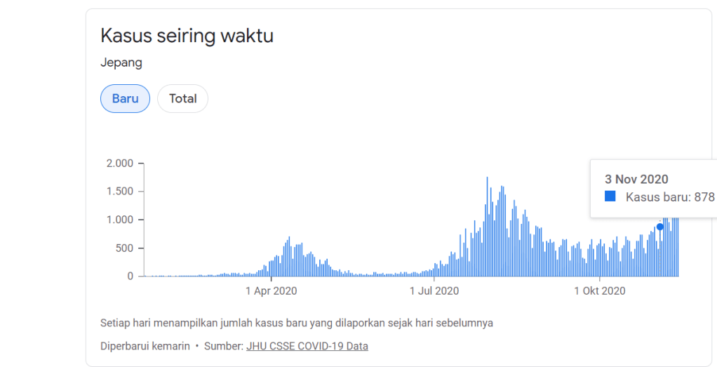 Per Tangggal 13 November 2020, Jepang mengkonfirmasi total kasus positif sebanyak 115,360 dan pada tanggal tersebut kasus positif harian di Jepang melonjak cukup drastis. Namun lonjakan tersebut juga terjadi pada tingkat kesembuhan di Jepang. Total tingkat kesembuhan di Jepang mencapai 101,018. Tentu sangat diharapkan Jepang dapat melandaikan kasus Covid-19 segera.