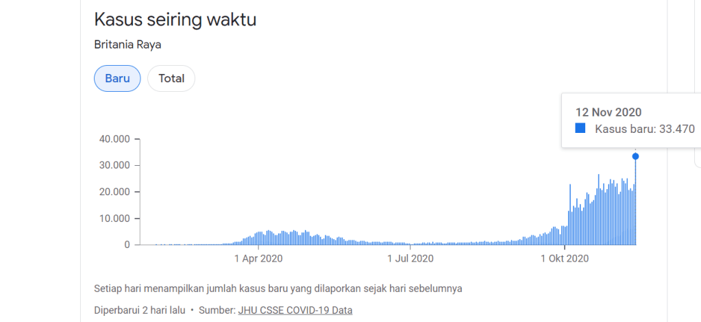 Pertanggal 12 November 2020 United Kingdom menerima lonjakan kasus baru sebanyak 33.470. dengan kasus lonjakan tersebut total kasus yang diterima sebanyak 1.290.195 .Tidak diberitahukan beberapa tingkat kesembuhan pasien Covid-19 pada negeri Ratu Elizabeth. yang pasti masyarakat United Kigdom perlu untuk terus menjaga protokol kesehatan yang berlaku.