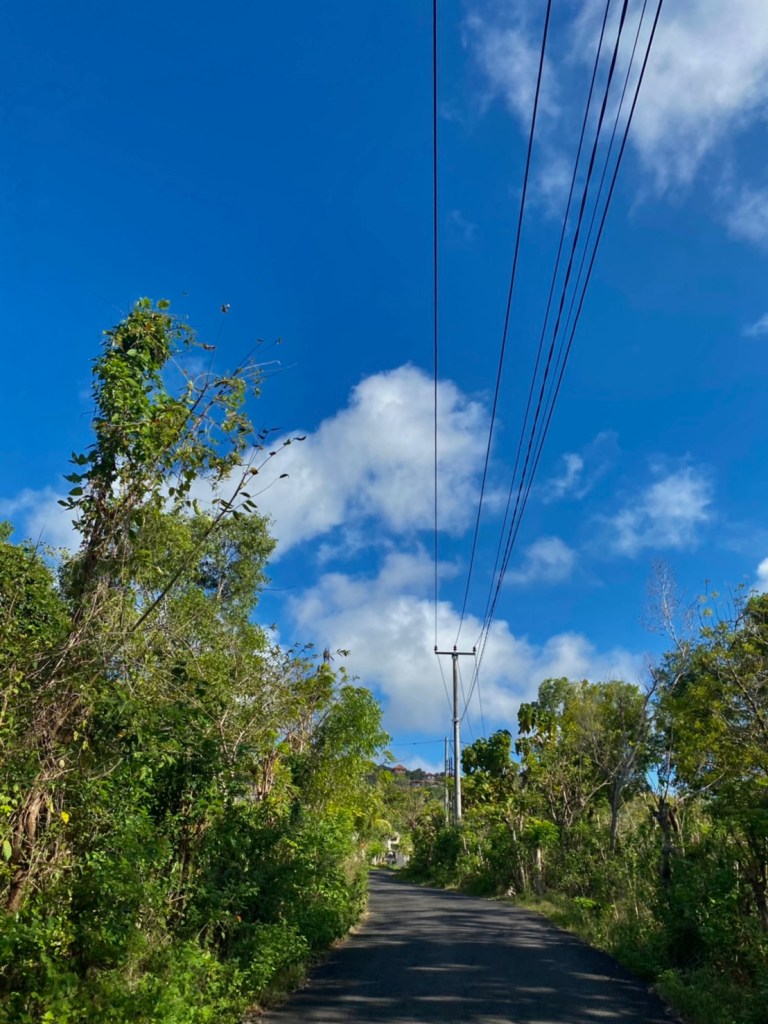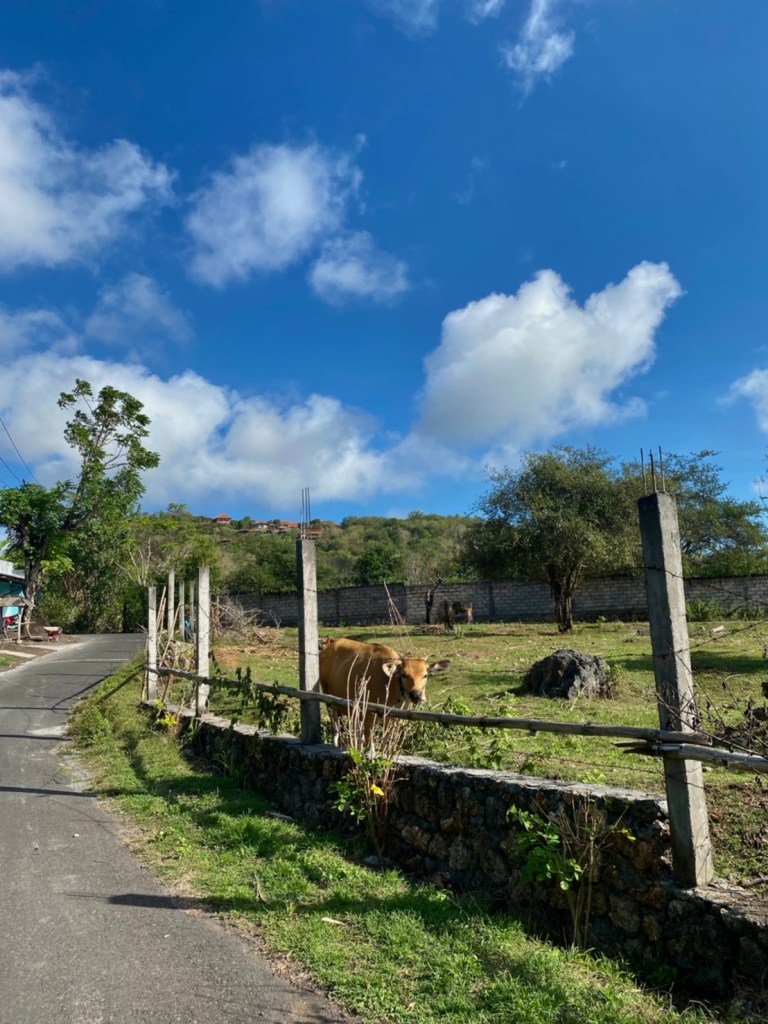 Setelah menaiki anak tangga yang cukup melelahkan, saya memutuskan untuk mengunjungi Pantai Dream Land. Untuk ke sana kamu perlu melewati jalanan lika-liku dan perpohonan yang rindang! Sesekali saya menemukan sapi yang lucu sedang memakan rumput.